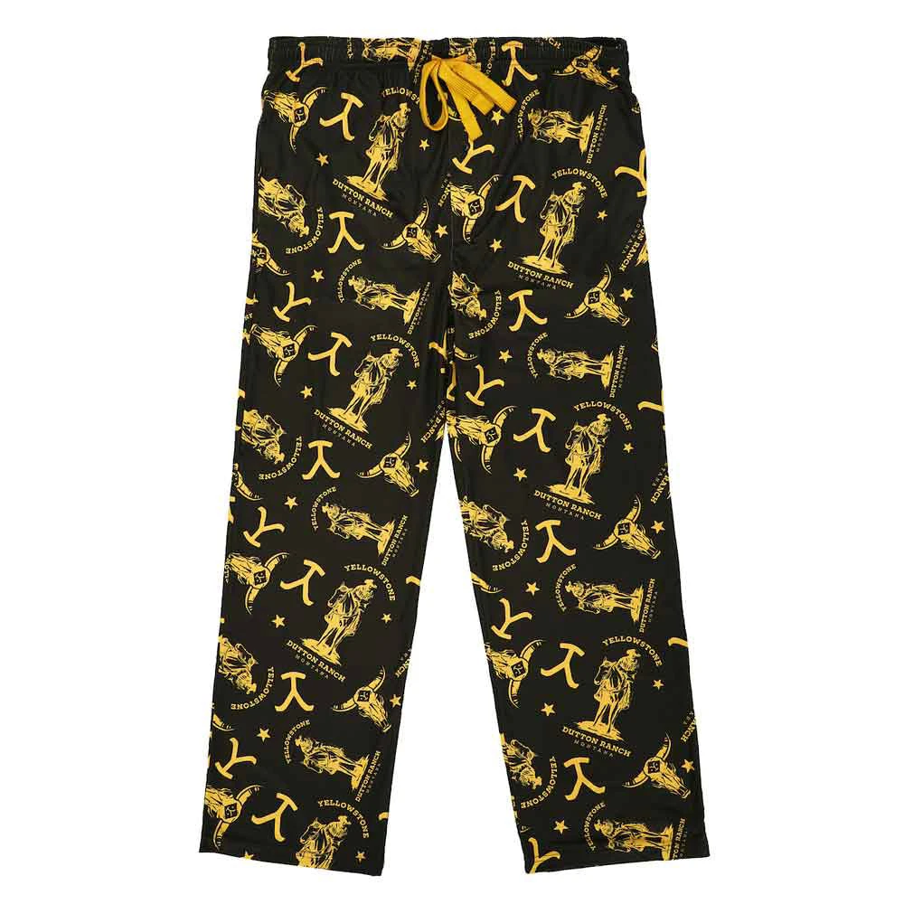 Show some love for your favorite TV drama with these comfy sleep pajama pants. Images of the Yellowstone logo and a cowboy on a horse decorate these sleep pajama pants while yellow letters spell out, “Yellowstone, Dutton Ranch, Montana.” Yellowstone fans will love this fun custom design.