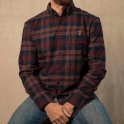 Yellowstone Dutton Ranch Embroidered Navy Plaid Flannel Shirt