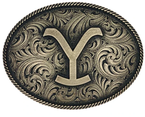 Every rancher needs a belt buckle. Inspired by the Yellowstone TV series, The Dutton Family Y brand is placed in the center with ornate filigree surrounding it. This buckle has antiqued black paint for contrast and trimmed in a rope detail. The Yellowstone Dutton Ranch Gold Y Logo Belt Buckle made by Montana Silversmiths is a perfect representation of the Dutton Ranch.