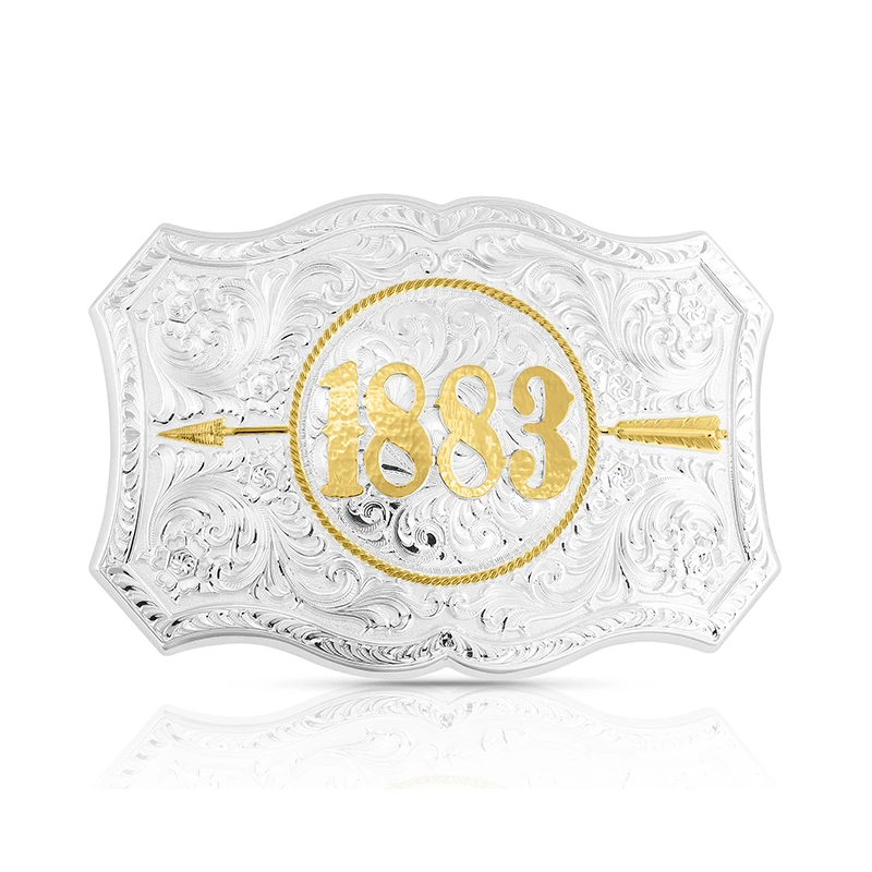 Every rancher needs a belt buckle. The Yellowstone 1883 Filigree Silver Belt Buckle made by Montana Silversmiths is a perfect addition. The large, scalloped shape belt buckle with a polished etched feathered trim, silver-finished filigree vines that flow and curl surrounding a bright gold cut engraved rope to represent a bow with an arrow stretching through, and an 1883 logo sits between the arrow, foretelling a story within.