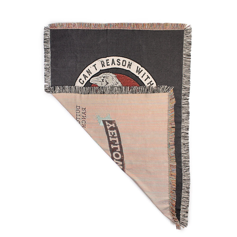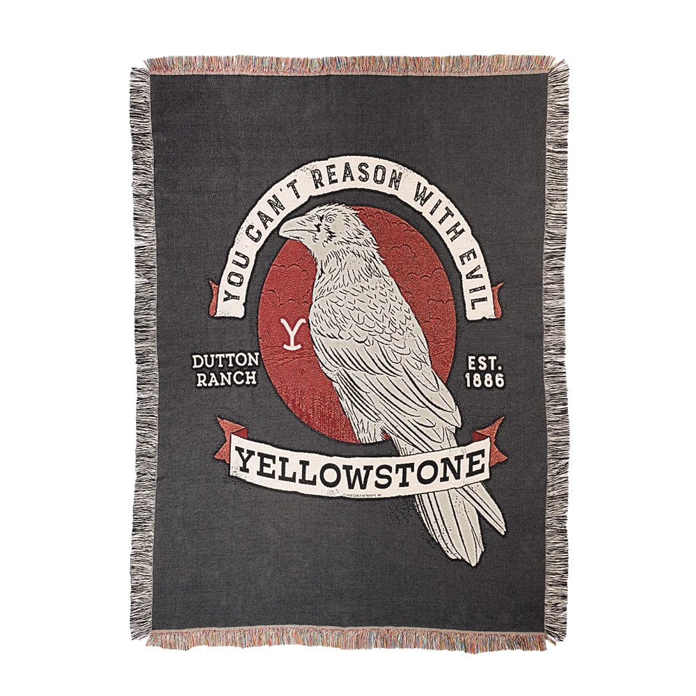 Featuring the iconic crow from Yellowstone Season 4, this Yellowstone Can’t Reason With Evil Woven Blanket is sure to make a statement in your home. Perfect for getting cozy on the couch while you watch your favorite Yellowstone season.