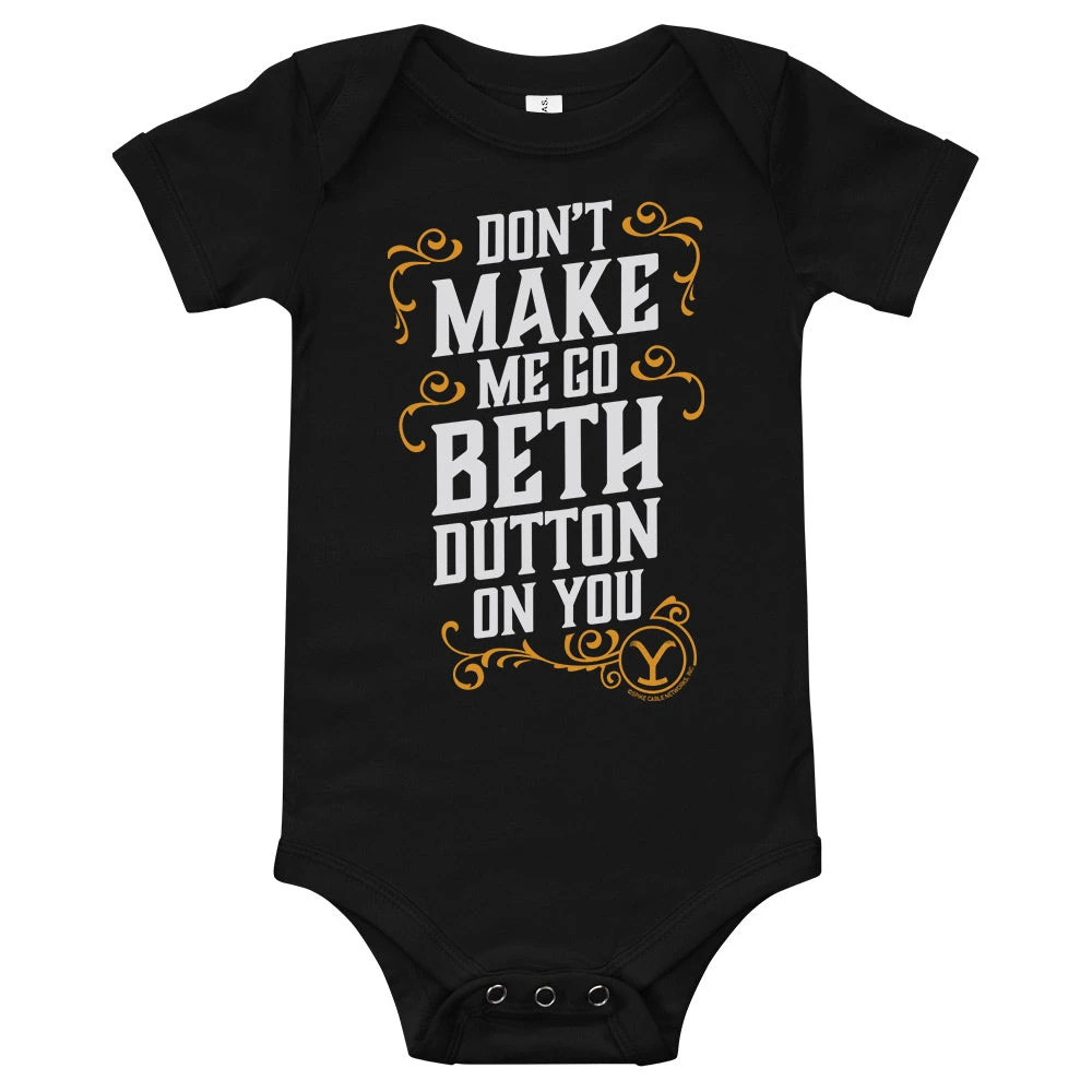 This Yellowstone Don’t Make Me Go Beth Dutton On You Baby Bodysuit is a hilarious addition to your little rancher’s wardrobe. Comfortable and adorable, this Yellowstone onesie reminds everyone to treat your baby with respect for their inner Beth Dutton!