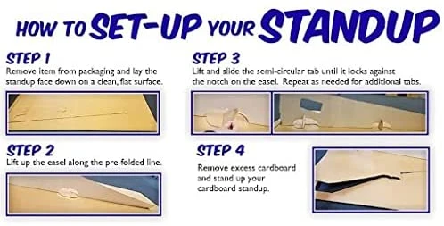 - Material: This cardboard cutout is printed on heavy cardboard with a built-in easel base. The item is free-standing and easy to assemble.