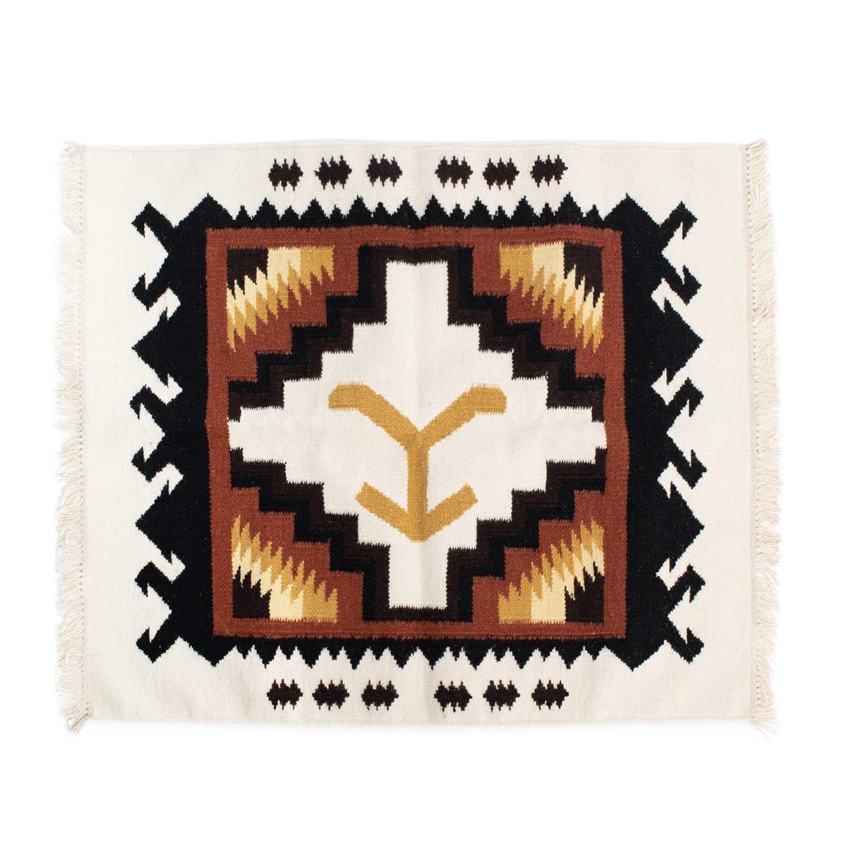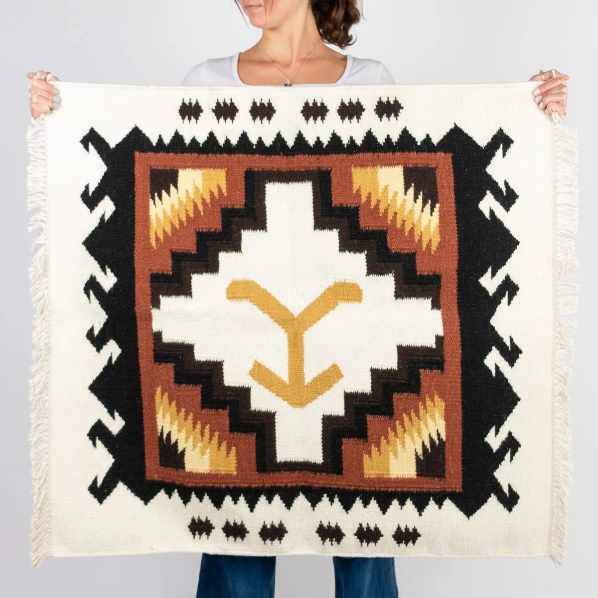 This is a high quality handwoven wool saddle blanket for horses or rustic decor with a touch of Yellowstone within the design. Featuring the iconic Yellowstone Y hand woven in the center, this saddle blanket is handcrafted with fabulous repurposed wool, and has both rich colors and craftsmanship.