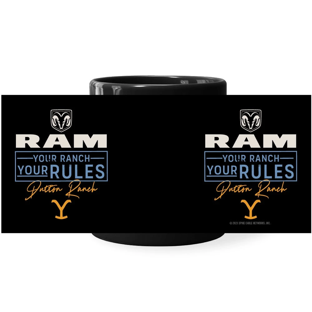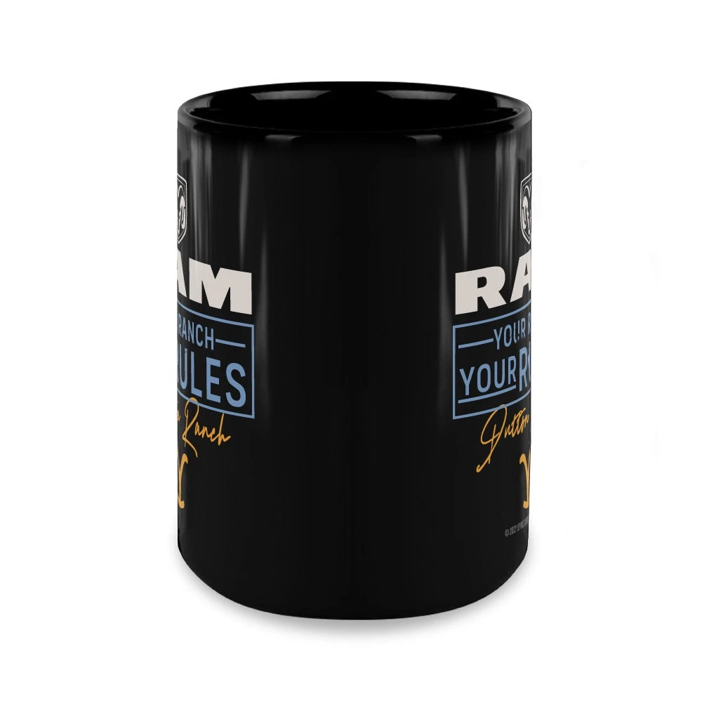 A great mug for any fan of Yellowstone and Ram trucks – the Yellowstone x Ram Truck Your Ranch Your Rules Black Mug! This sleek black mug features the iconic Ram logo alongside the Yellowstone logo and the words “Dutton Ranch”