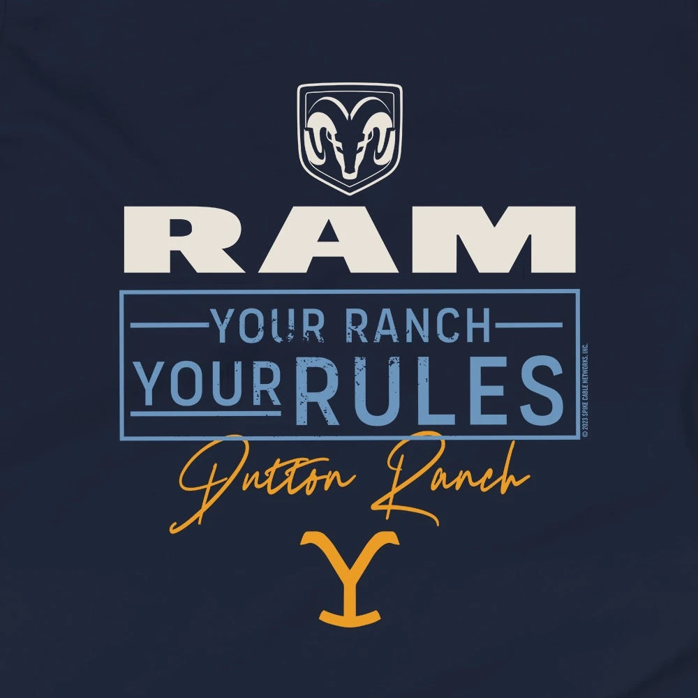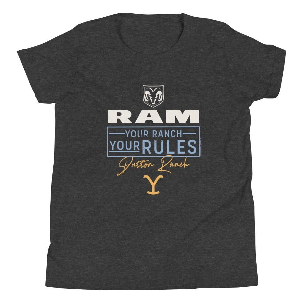 A T-shirt that both fans of Yellowstone and Ram can enjoy – the Yellowstone x Ram Truck Your Ranch Your Rules Youth T-Shirt. This tee features a striking design with the Ram Truck and Yellowstone logos emblazoned on the front, along with the words “Dutton Ranch” to show your support everybody’s favorite ranch.